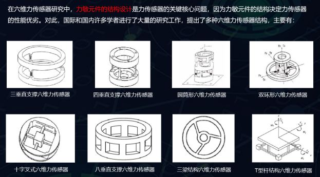 在六維力傳感器研究中,力敏元件的結(jié)構(gòu)設計是力傳感器的關(guān)鍵核心問題,因為力敏元件的結(jié)構(gòu)決定力傳感器的性能優(yōu)劣。對此,國際和國內(nèi)許多學者進行了大量的研究工作,提出了多種六維力傳感器結(jié)構(gòu),如下圖展示: