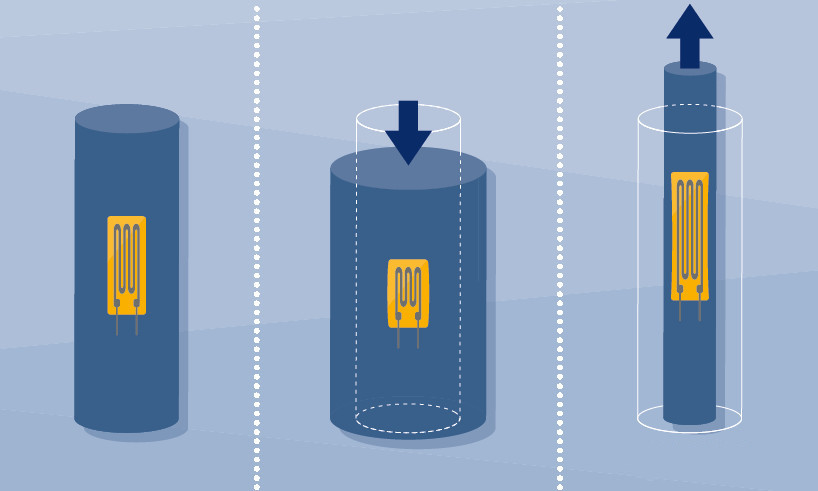 為了生產(chǎn)力傳感器,除了應(yīng)變片外還需要一個(gè)彈性體 - 例如采用不銹鋼。應(yīng)變片將牢固地黏貼在彈性體上。我們采用彈性體最簡單的形式 - 鋼圓柱體來進(jìn)行說明。