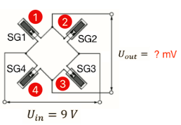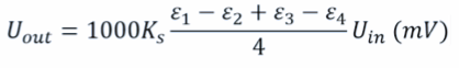 假設(shè)材料為鋁材,應(yīng)變計(jì)靈敏度系數(shù)為Ks=2.1.激勵(lì)電壓為Uin=9V。理論上信號(hào)輸出Uout可以被估算出來,只要知道這四片應(yīng)變計(jì)的應(yīng)變就可以了。