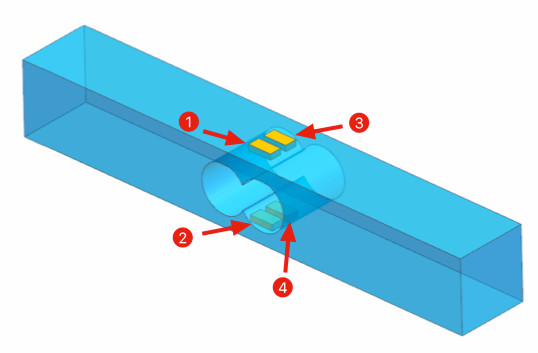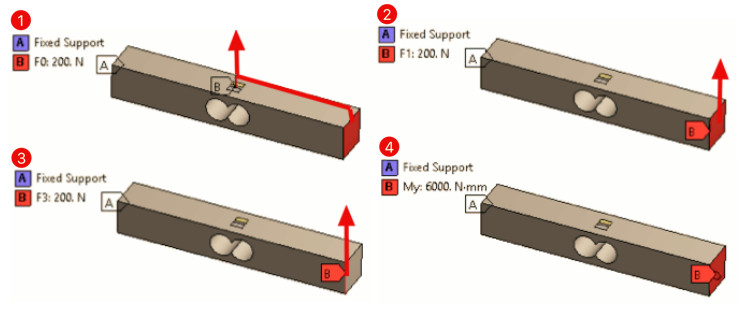 這很容易在有限元軟件中模擬并獲得應(yīng)變、變形等數(shù)據(jù)。天平君將計(jì)算四種工況下電橋的理論信號(hào)輸出。根據(jù)上面的公式,有限元仿真只需要計(jì)算應(yīng)變計(jì)表面的沿著絲柵方向的平均應(yīng)變。為了方便分析,有限元結(jié)果提取時(shí)將每片應(yīng)變計(jì)的最大應(yīng)變與最小應(yīng)變加起來再除以2表示平均應(yīng)變。