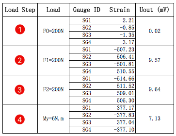 再給出計(jì)算結(jié)果的數(shù)據(jù)表。根據(jù)前面介紹的計(jì)算方法,各應(yīng)變計(jì)的平均應(yīng)變?cè)诟鞴r下被提取出來,用于輸出信號(hào)的估算。說好的力與信號(hào)有比例關(guān)系啊,為什么工況1的情況下信號(hào)接近0呢,而其它相同大小的力卻能產(chǎn)生很大的電信號(hào)?